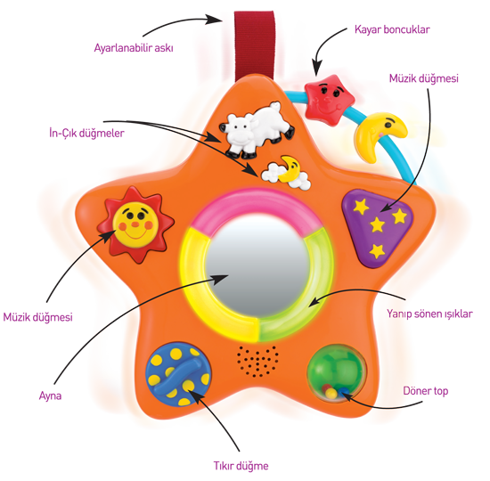 İster yatağa ister arabaya ister oyun parkına takılabilen ayarlanabilir askısı ile Işıklı Yıldızım her yerde. Çevresinde ışıklar yanan aynası, kayar boncukları, döner top ve tıkır düğmeleriyle Işıklı Yıldızım bebeğinizin baş ucu oyuncağı.