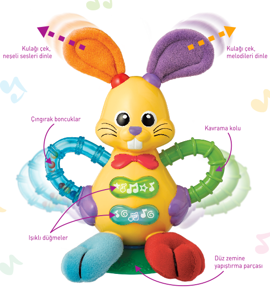 Ses efektli kulakları ve ışıklı düğmeleriyle neşeli melodiler çalan tavşancık, bebeğinizin yeni yemek arkadaşı. Yapıştırma parçası sayesinde mama sandalyesine kolayca tutturun, mamayı kaşıklayın!